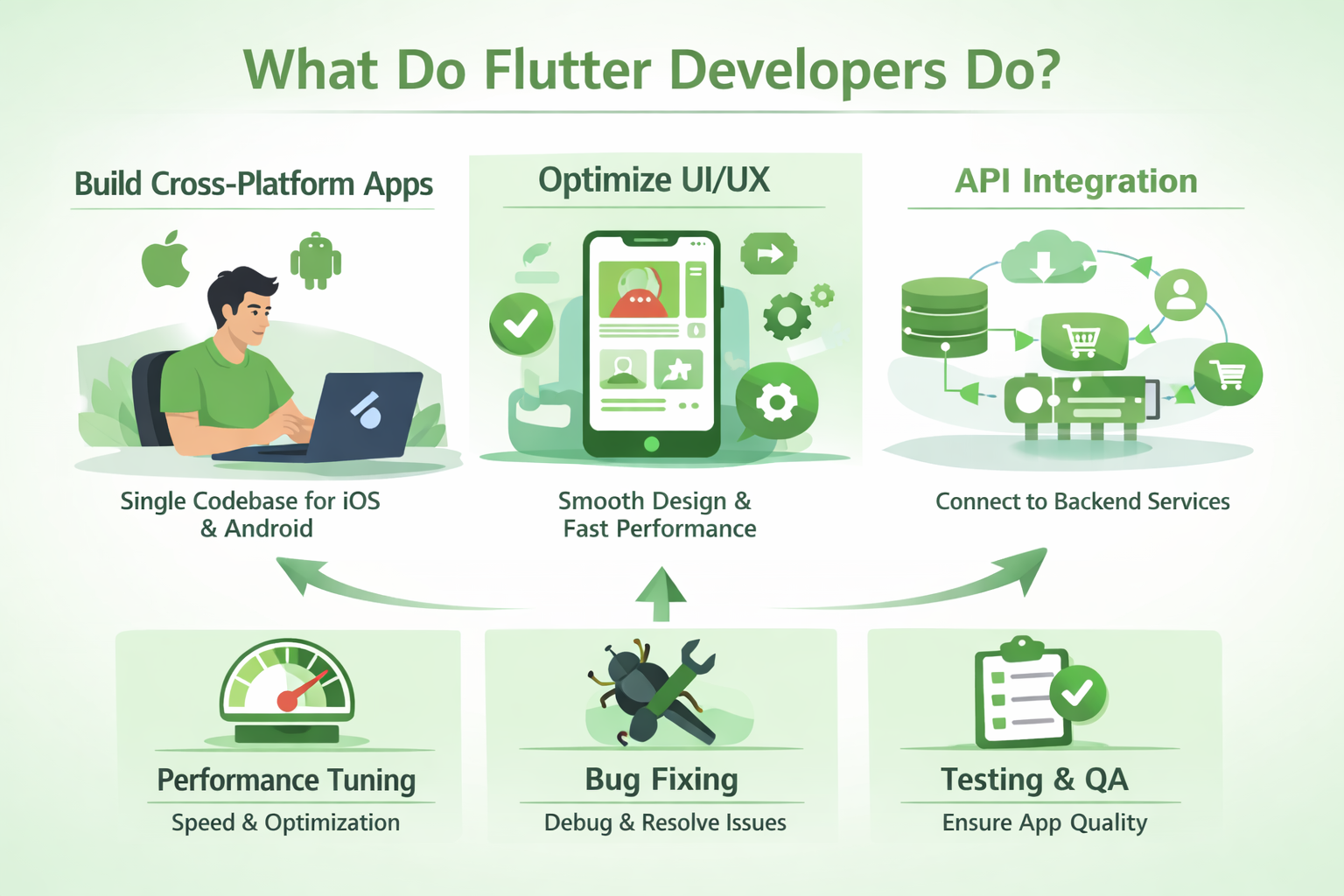 For Example, think about a shopping app. A Flutter developer would be responsible for building the user interface (UI) that customers interact with, ensuring smooth animations, easy navigation, and quick load times on both Android and iOS devices.