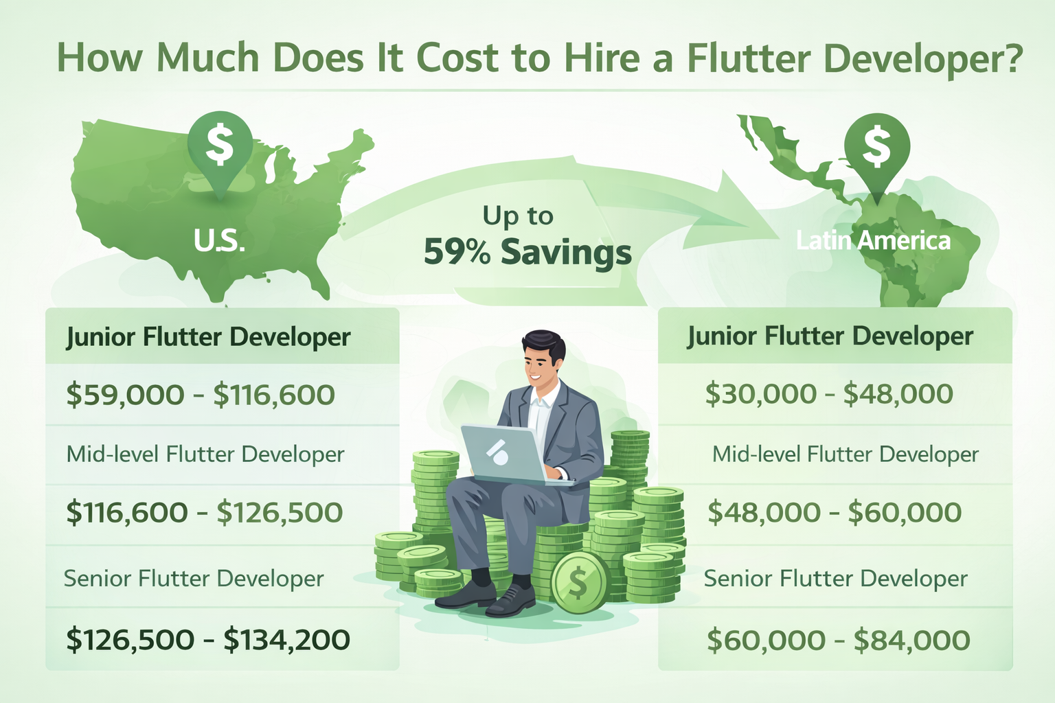 - Cost-Effective Solutions: One of the biggest advantages of hiring offshore developers is the cost savings. For example, hiring a senior Flutter developer in the U.S. might cost over $130K annually, but in countries like Brazil or Mexico, you can find similar talent for as low as $60K—saving you up to 59% on salary expenses.