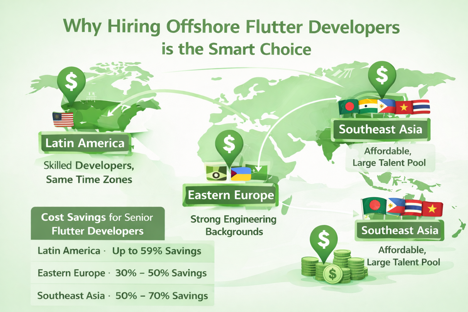 In fact, many regions, particularly in Latin America, Eastern Europe, and Southeast Asia, have highly skilled Flutter developers who are ready to deliver exceptional results at a fraction of the cost.