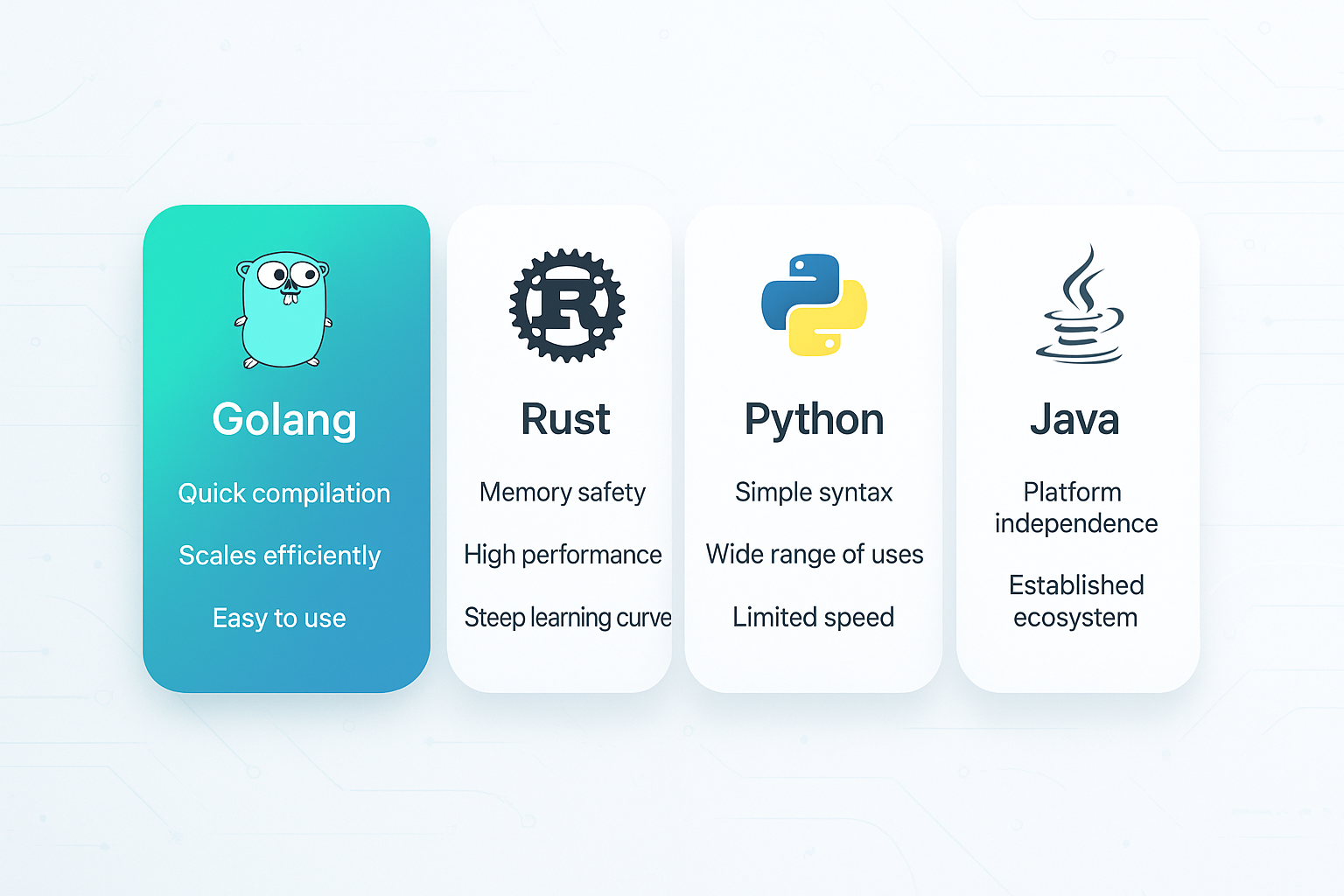 Compares Golang vs Rust, Python, and Java with real-world clarity, helping readers make an informed tech choice.